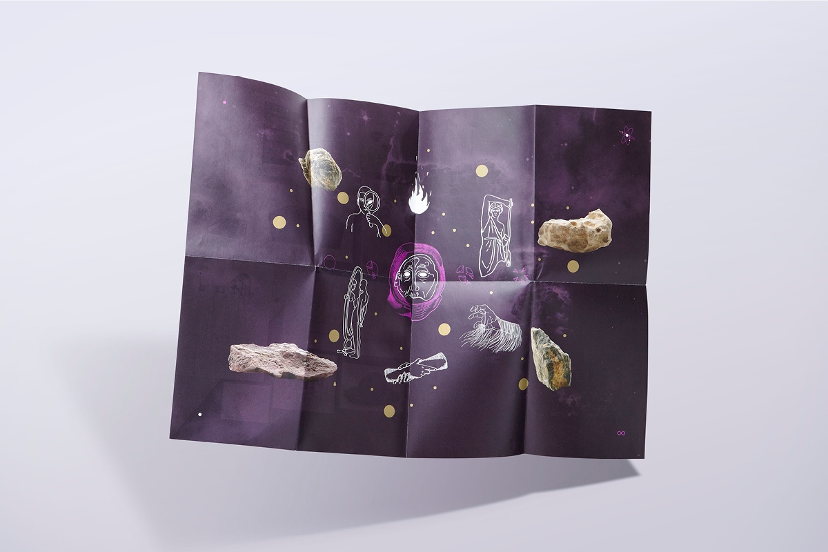 Symbolism plays a predominant role in the project, as each artwork is accompanied by a series of symbols that attempt to decipher its deeper meaning. These are revealed in all their mystical majesty on the website’s homepage, where no information is given about what each of the sixteen symbols that appear there mean and where each one leads. The same philosophy is applied in all the project’s communication material, from the collectible poster / brochure that was distributed during the exhibition to the short animated videos and custom font created for it.